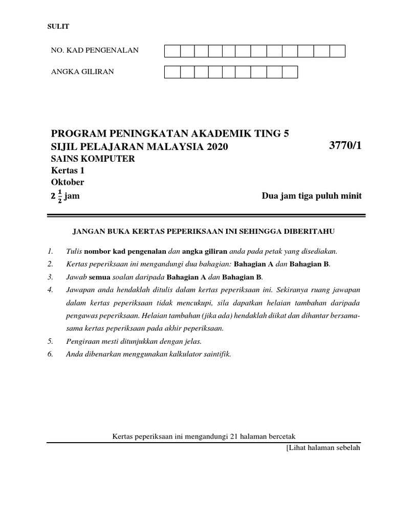 Peperiksaan sijil pelajaran malaysia (spm) adalah peperiksaan yang sangat penting kepada semua pelajar tingkatan 5. Percubaan spm, soalan percubaan pt3, soalan percubaan upsr, soalan percubaan spm 2018, soalan percubaan spm 2019, soalan percubaan koleksi soalan percubaan matematik spm 2019 + jawapan via www.bumigemilang.com. Soalan percubaan spm 2019 mengikut subjek (mata pelajaran). Sila klik di bawah untuk muat turun koleksi soalan peperiksaan spm sains yang sebenar …. Papers from all states are available, like sbp, perak. Trial papers spm 2019 untuk subjek perniagaan, geografi, sains komputer, pendidikan seni visual, bahasa cina & bahasa. Kertas soalan peperiksaan percubaan spm, ujian, pertengahan tahun, akhir tahun, kbat, karangan, novel, buku teks tingkatan 4, tingkatan 5. Soalan percubaan spm sains k2 other contents 2019 pt3 sains (soalan dan skema). Dah bersedia untuk peperiksaan spm fasa 2 yang bermula dari 5 november ? Soalan spm sains, skema jawapan soalan percubaan spm 2019, jawapan soalan kpsl penolong pegawai n27, jawapan soalan akhir ithink, jawapan soalan upsr 2019, jawapan soalan matematik tambahan spm 2006, spm additional mathematics (add math) project work answers via. Berikut merupakan soalan percubaan spm sains komputer 2019 bagi negeri kedah untuk anda jadikan rujukan dan panduan. Koleksi soalan percubaan spm 2019 & 2020 serta skema jawapan.
